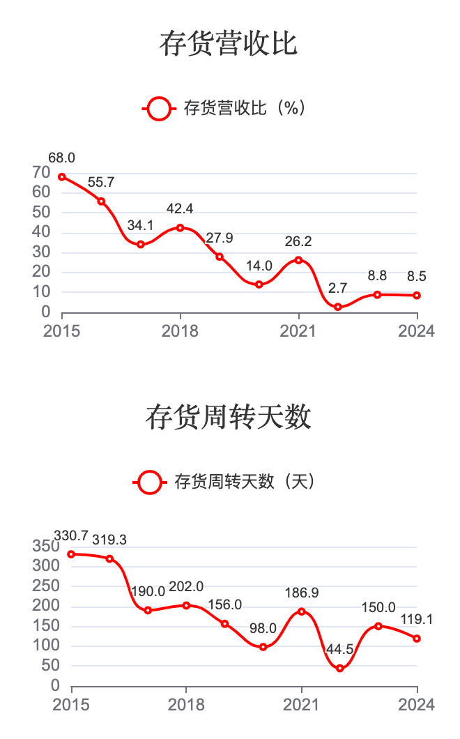 存货营收比和存货周转天数,在波动中总体趋势是下降的。2024年8.5%占比不算高,但是周转天数119天超过了90天,有点长。还是要注意存货风险。
