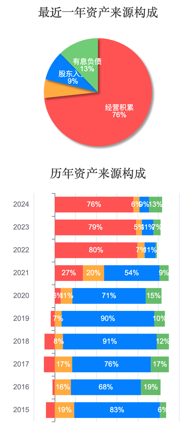 2021年,经营积累占比大幅跃升至27%, 自2022年起,公司资产的来源结构发生质变。经营积累的占比急剧上升并稳定在高位,2024年为76%。而股东入资的占比降至很低水平。公司实现了从依赖外部输血转向内生性积累。完成了从“依赖融资”到“自我造血”的转型。