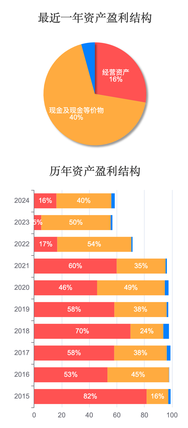在2022年之前,公司的资产主要以经营资产为主,占比通常在50%以上。这符合一家制造业公司的常态。同时现金占比也很大。