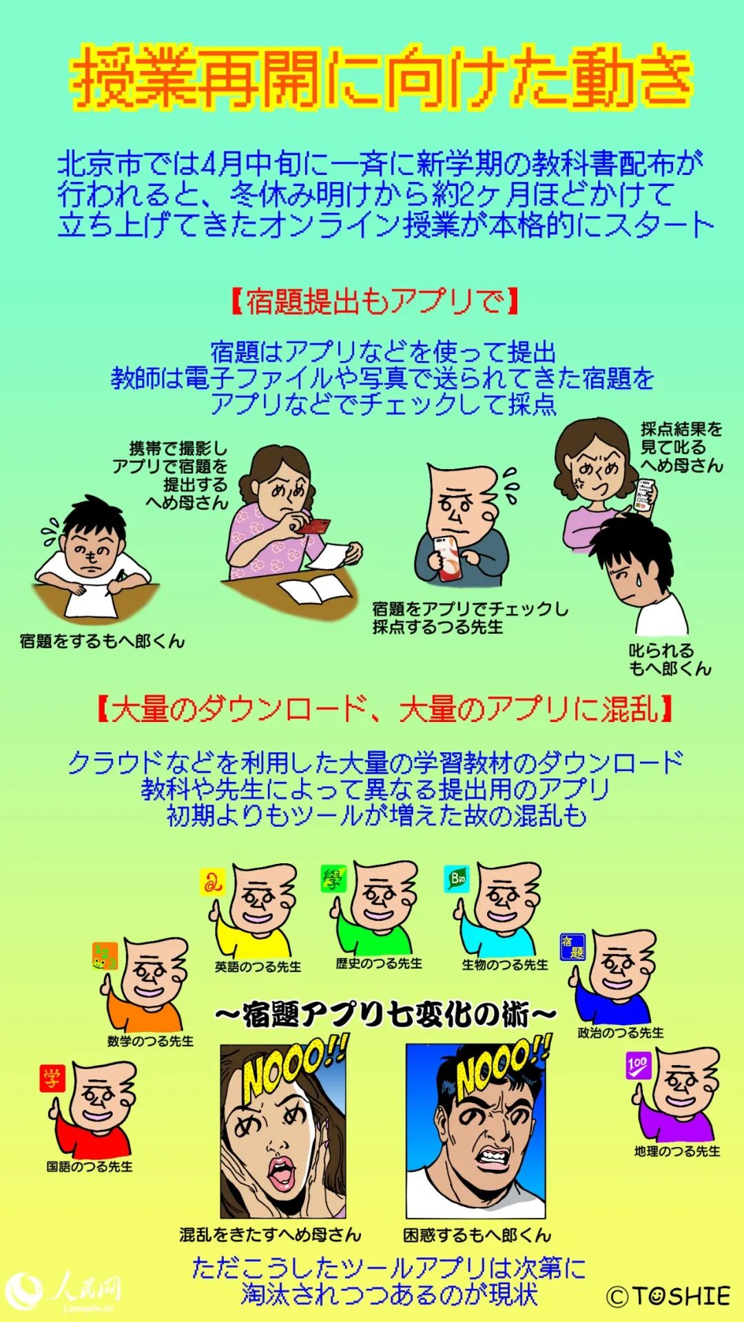 各教育機関のオンライン授業体制のバラつきから、特に義務教育段階である小中学校においては、新学期のカリキュラムのスタートを見合わせる指導が行われ、北京市では4月中旬まで前学期の復習を中心とした授業やオンライン学習教材の提供が行われていた。4月中旬に一斉に新学期の教科書配布が行われると、冬休み明けから約2ヶ月ほどかけて立ち上げてきたオンライン授業が本格的にスタート。各学校のプラットフォームやクラウドサービス、スマホアプリ、各区が提供するオンライン学習教材などを活用したオンラインによる授業と宿題提出、小テストの実施などが次々行われるようになっていった。