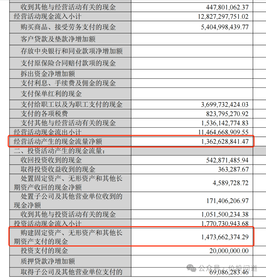 自由现金流多数年份都要比净利润低,说明企业的再投入还是比较大的。我们来看看2023年购建固定资产、无形资产和其他长期资产支付的现金,与经营活动产生的现金流量净额的比值,来验证一下再投入是不是比较大。二者相除结果是108.2 %。这个比值就太高了。