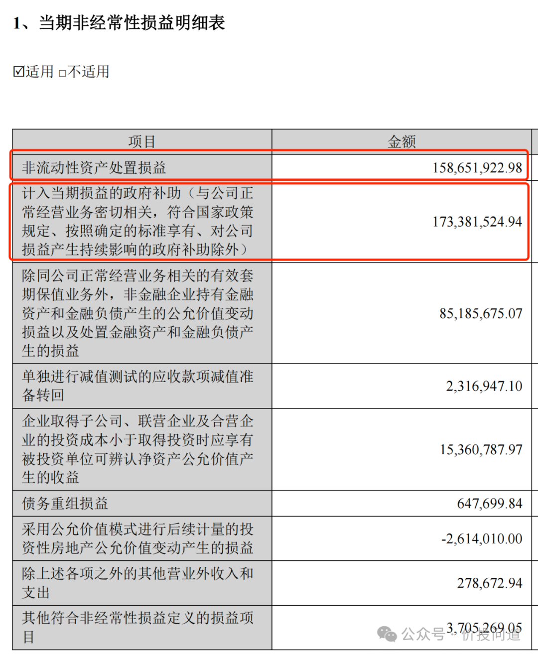 这个占比太高了。要看下是什么非经常性损益。我们看下2023年财报里,非经常性损益的明细。占大头的一个是处置了非流动性资产,另一个是政府补贴,这都不太好。政府补贴不能依赖,处置资产也不是什么好信号。
