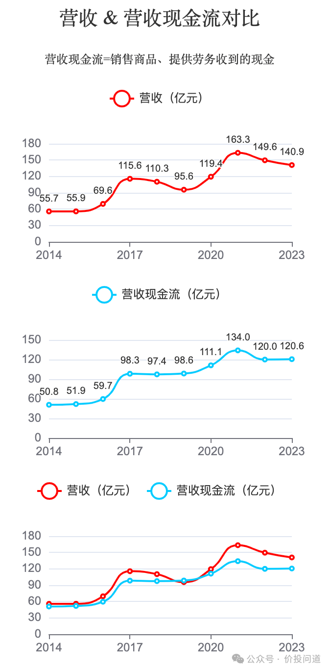 营收波动式上升,2023年达到140.9亿。营收现金流大部分年份低于营收,2023年营收现金流占营收的85.6 %。营收的含金量一般。这个比值我们一般是要求超过100%的。这可能是应收款比较多导致的,等一下要重点看看应收风险。