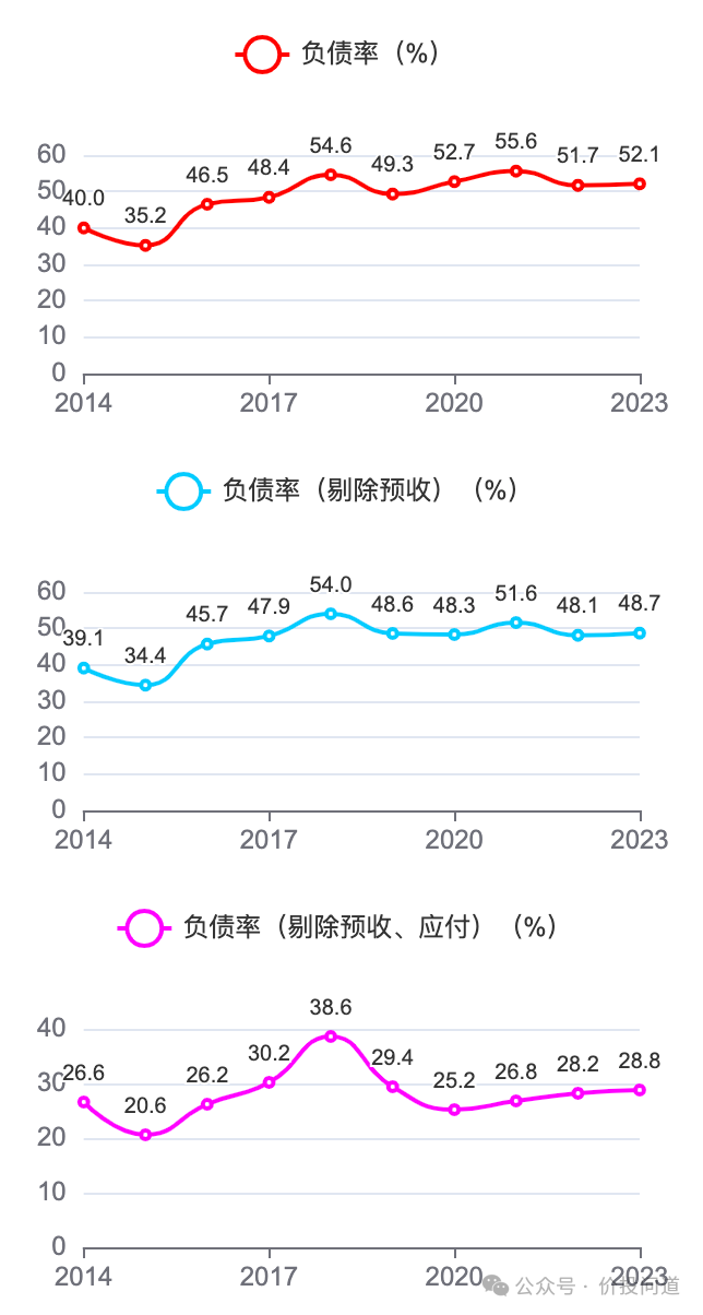 负债率从2014年的40%到2023年的52.1 %,有所增长。负债率超过50%就太高了。不过,剔除预收、应付以后,负债率降到了28.8 %,还算可以接受。