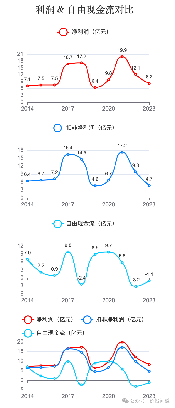 净利润上下波动较大,2023年8.2亿。扣非净利润与净利润有一定的差距,2023年4.7亿元。也就是说非经常性损益占了净利润的42.7 %。