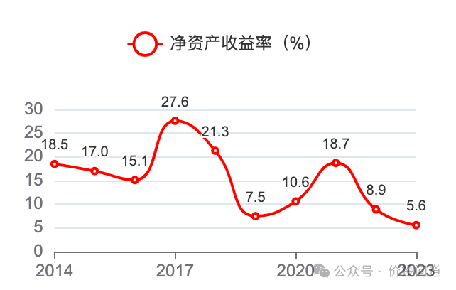 净资产收益率波动也比较大,总体是下降趋势,2023年5.6 %。远远达不到15%,也是一个很低的数值。