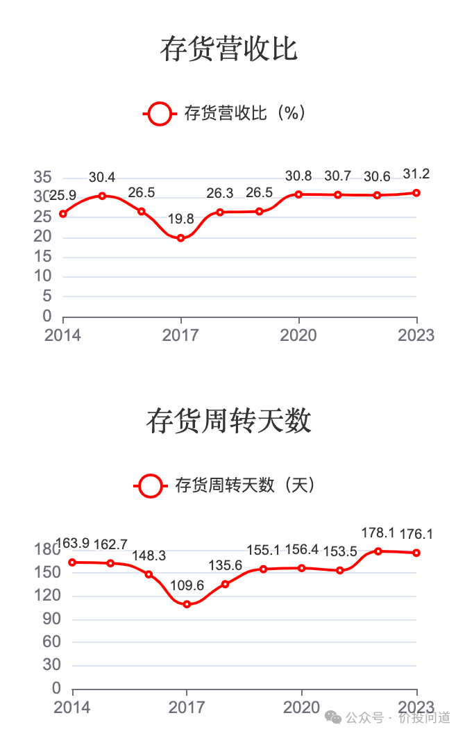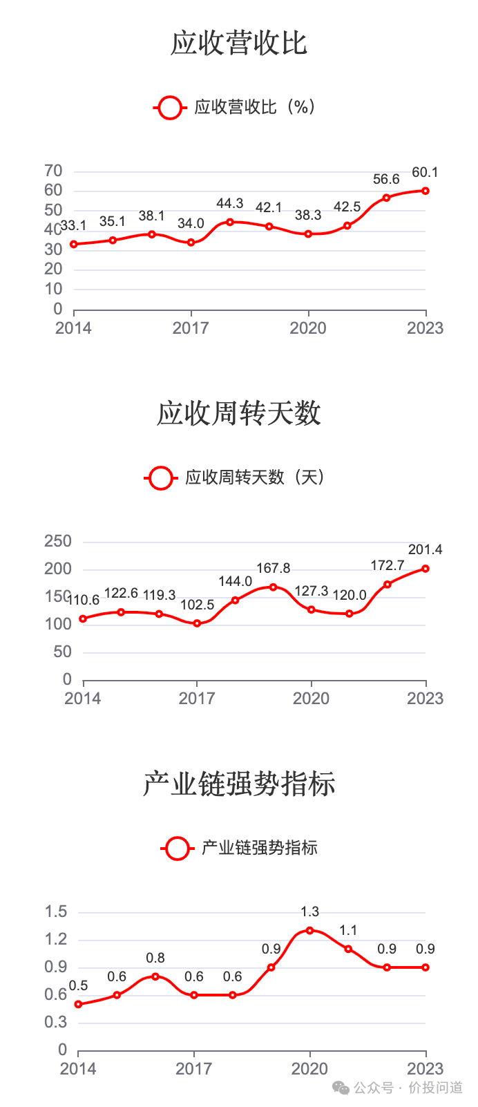 应收占营收比,从2014年的33.1 %到2023年的60.1 %,持续上升,应收款是越积越多。这个比值超过30%,应收风险就比较大了。我们前面讲营收现金流的时候说过,营收现金流低于营收,多数是应收款导致的。现在验证了,应收的占比确实很高。