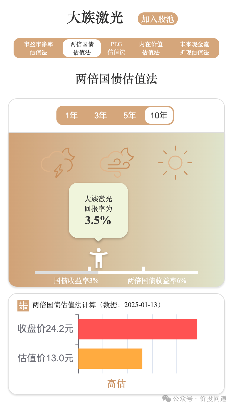 或者用每股收益除以两倍国债收益率,得到一个估算价格是13块,比实际的24.2块要低。说明是偏高估的。