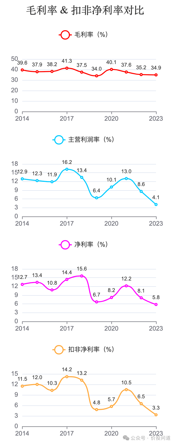 经营利润率,是毛利扣除四费后的利润率,波动很大,2023年的4.1 %。