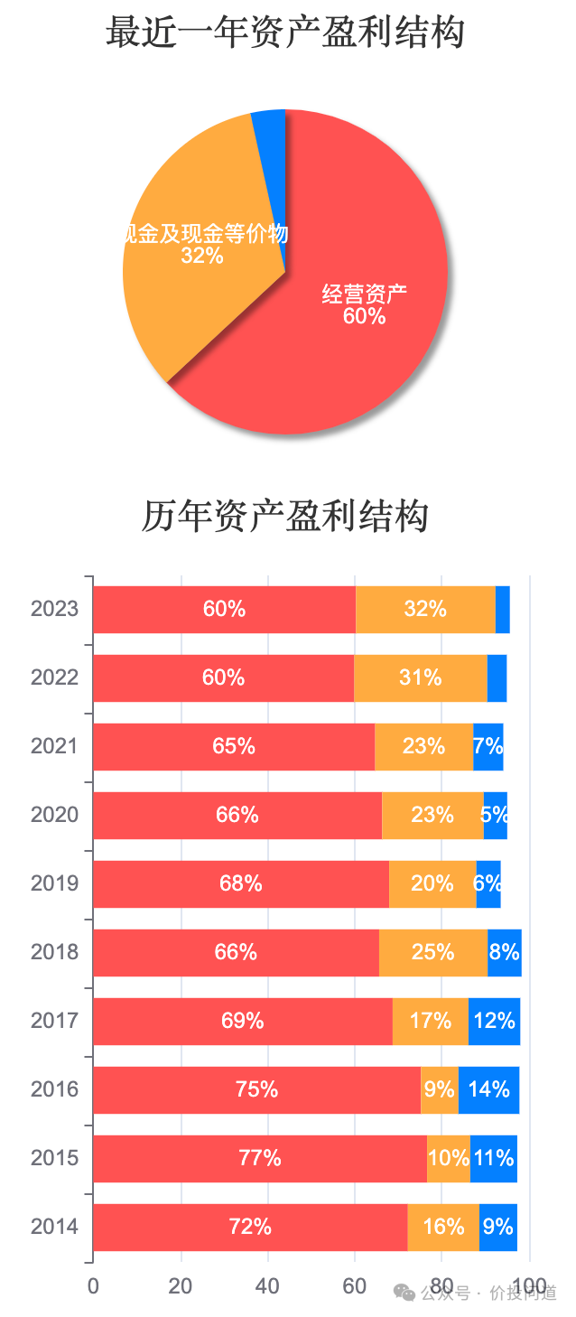 经营资产占比60%,现金及现金等价物占比达到了32%,投资资产占比在3.3 %。现金及现金等价物占比超过了25%,投资资产占比没有超过10%,不错。