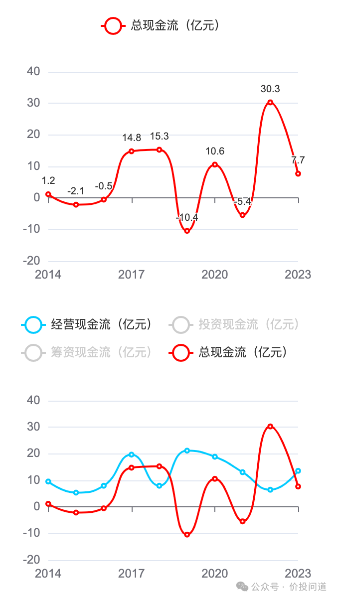 经营现金流净额波动比较大,但是总体来说还一直是正数。2023年13.6亿。