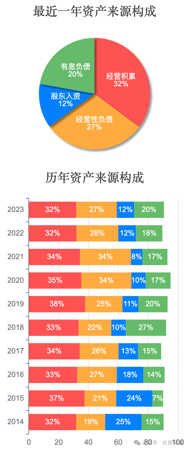 经营积累是主业赚的钱,占比32%,经营性负债是占用客户和供应商的钱,占比27%,。