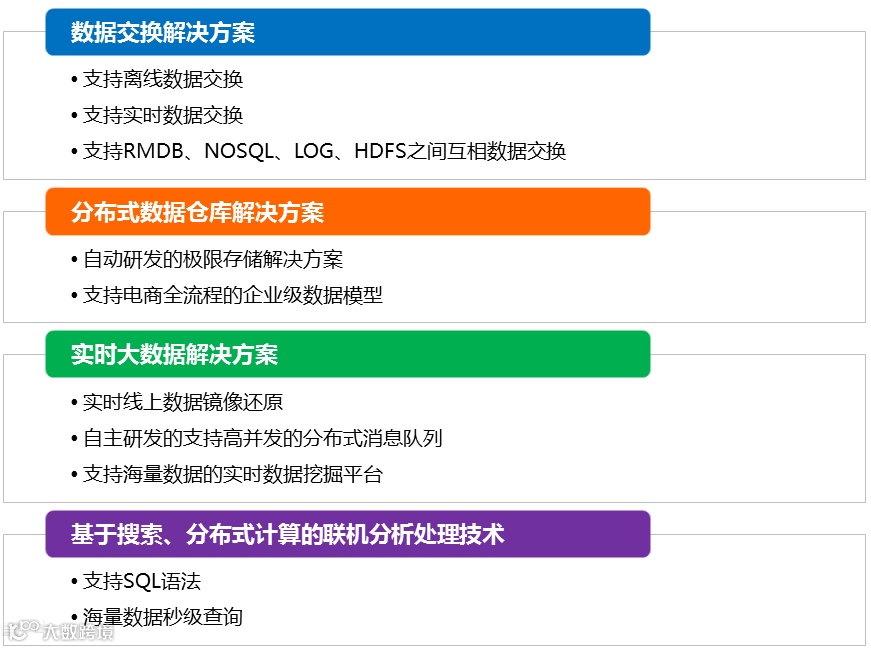 而在以上的技术架构基础上,建设大数据产品体系,支撑业务应用,创造数据价值,更是考验团队及管理者智慧的难题,大数据平台目前从以下四个方面开发了平台产品,为客户、为集团创造和展示有效有用的信息。