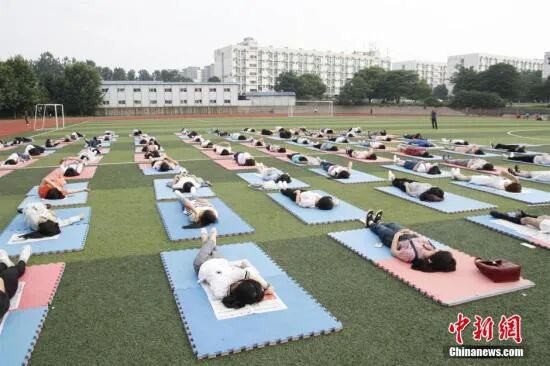 睡眠の質に対する関心を高めることを呼びかけるため「グラウンドで眠る」女子大生たち(撮影・劉湧志)。
