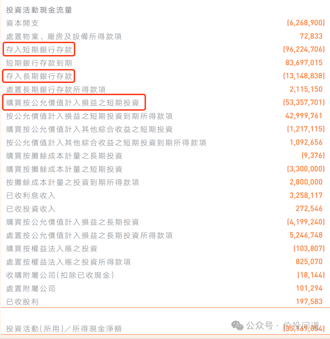 金额较大的现金流出是存入银行存款以及购买按公允价值计入损益之短期投资,这类投资主要指的是交易性金融投资,比如股票、债券、基金、期货等。
