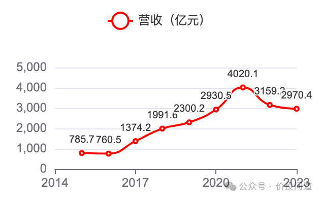 第二部分,盈利分析。营收从2015年以来,总体上还是一个上升的趋势,但是2021年到达一个高点之后,这两年又有所下滑,2023年2970.4亿元港币。