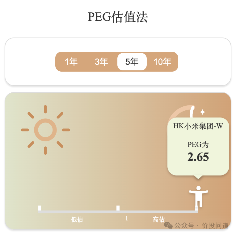 如果用PEG估值法来算,年度选择器选择5年,PEG是2.65,比1大,意味着是高估的。说明如果未来还是维持近五年的平均增长率,那么现在的估值就高了。