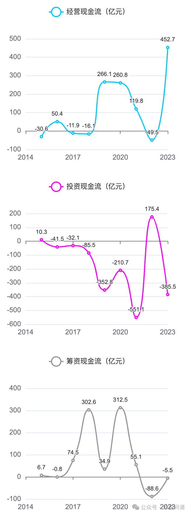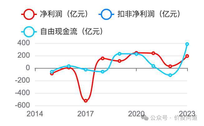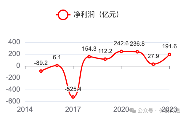 净利润前些年有亏有赚,近年基本上还是维持在盈利的状态,2023年191.6亿。