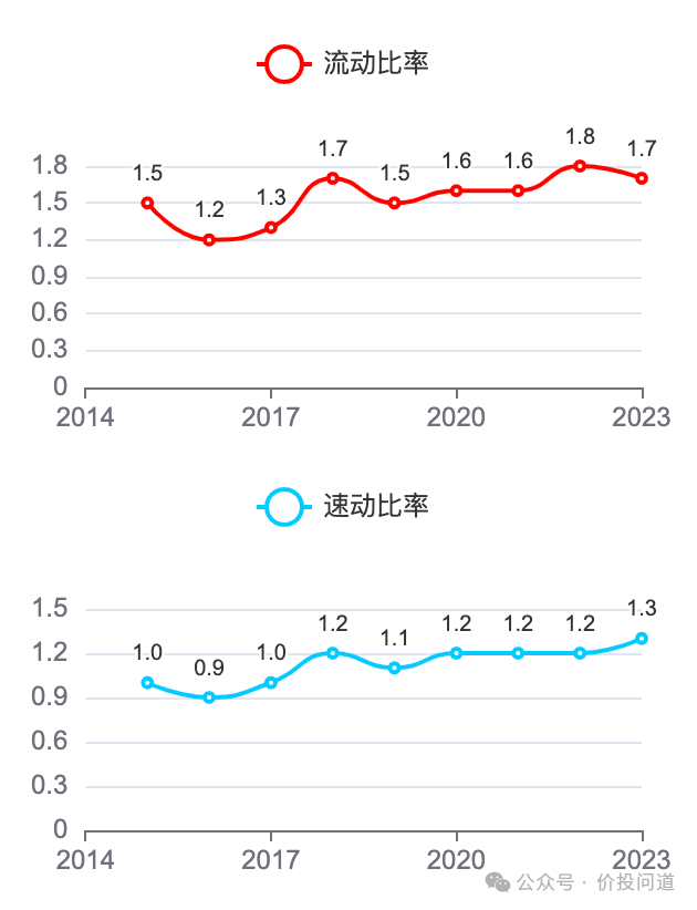 流动比率2023年1.7,没有超过2。速动比率1.3,比1大。偿债能力还算可以。