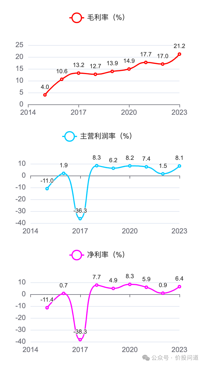 主营利润率差的时候是负数,多数时候在7%左右,2023年8.1 %。