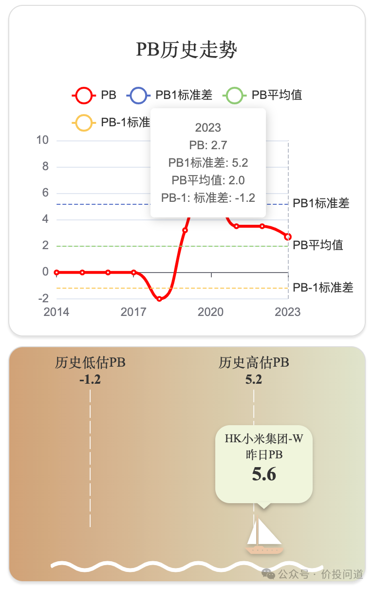 最后我们来看下估值,小米的历史PE平均值15.4,本文写作时37.9,介于历史高估和低估标准差之间。