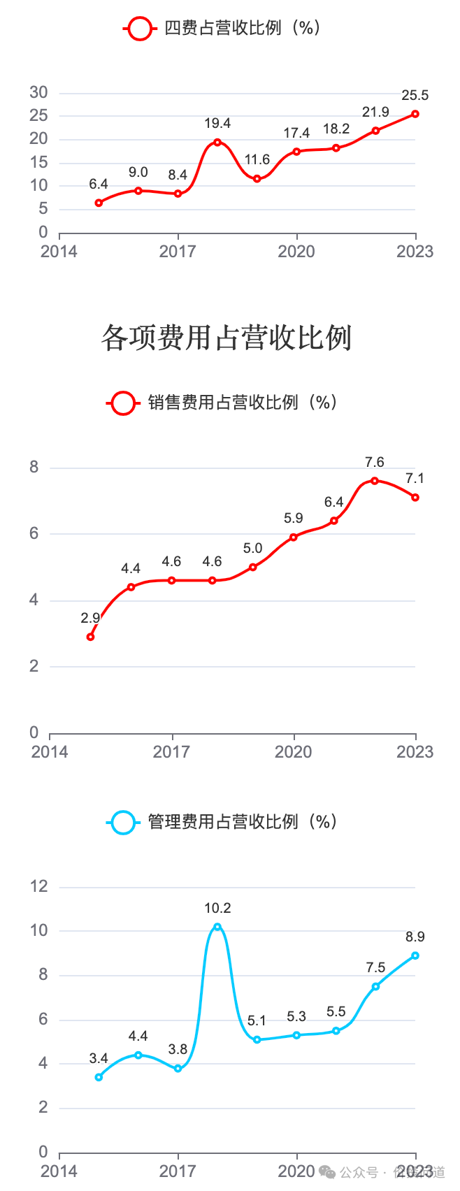 第三部分,经营分析。四费占营收比例总体来说一直在上升。销售费用占比前面一直在升高,2023年有所下降,达到7.1 %。