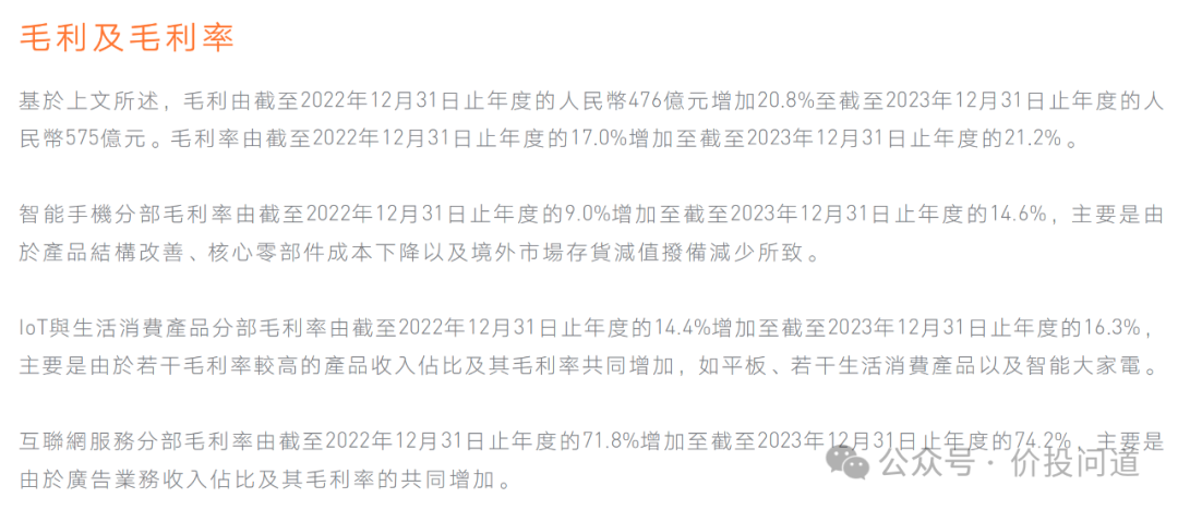 收入贡献最大的还是智能手机,占比从2022年59.7 %下降到了2023年58.1 %。第二大是IoT与生活消费产品,占比从28.5 %提高到了29.6 %,主要是空调、冰箱、洗衣机的出货量增加。互联网服务也略有增加,从10.1 %到11.1 %,主要是广告、游戏业务增加。