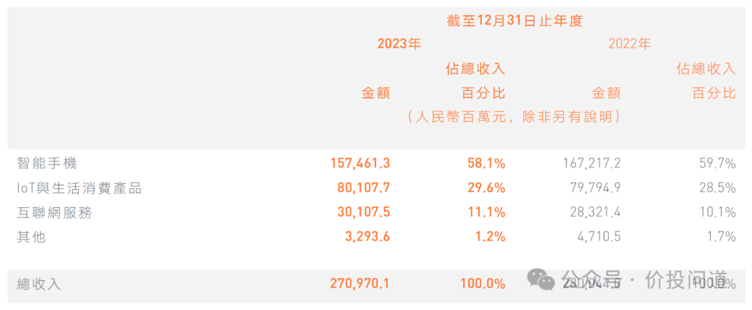 第一部分,主营构成。这部分数据较少,我们直接看下2023年的原始财报,会更加清晰一些。小米原始财报中的金额单位是人民币,而由于港股财报用什么币种的公司都有,为了方便比对,在我们的工具中,单位统一成了港币,所以这里金额的数字会有所差异。这部分我们主要看占比,所以货币单位没什么影响。