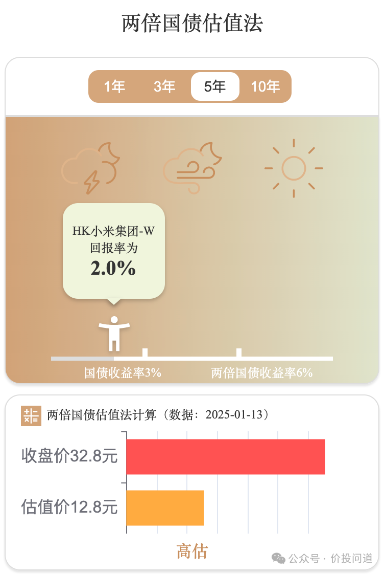 或者用每股收益除以两倍国债收益率,得到一个估算价格是12.8块,现在32.8块,比估值价要高。意味着是偏高估的。