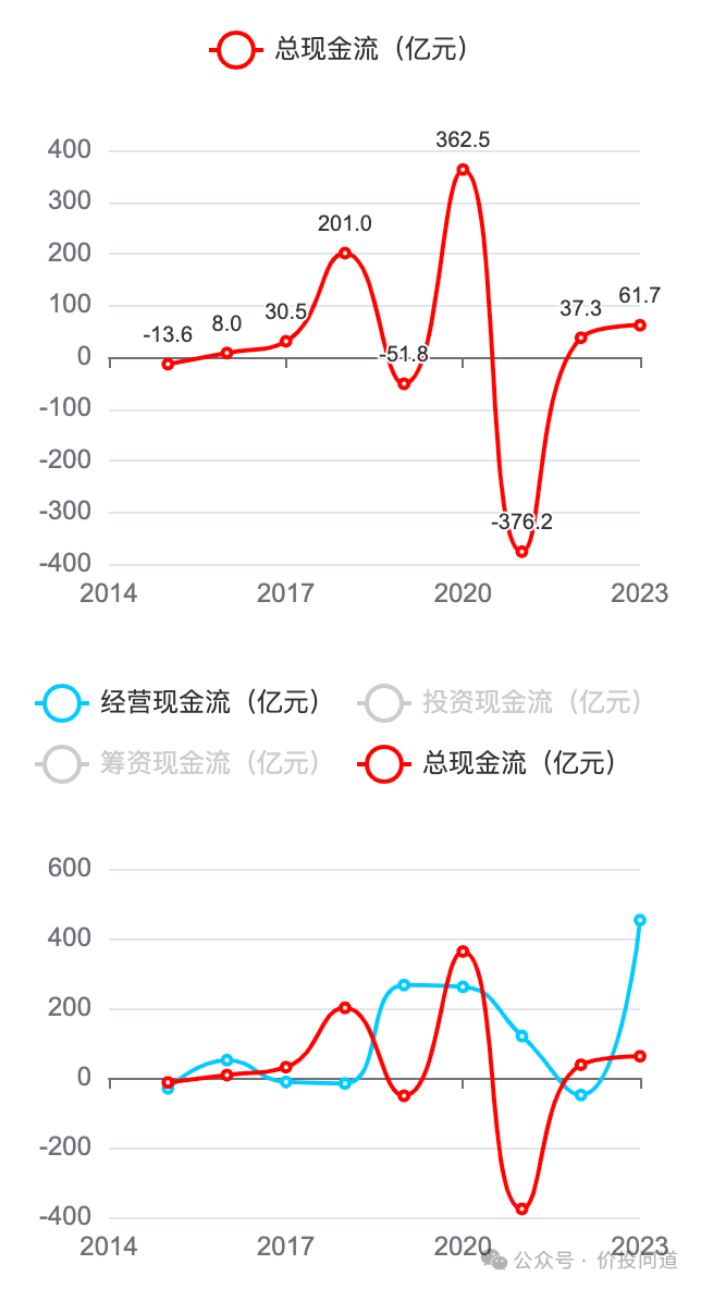 总现金流有正有负,经营现金流有些年份超过总现金流,有些年份又比总现金流小。这是不太好的现象。我们一般要求经营现金流要持续大于总现金流,才能说明经营现金流足以支撑经营、投资和分红的流出。