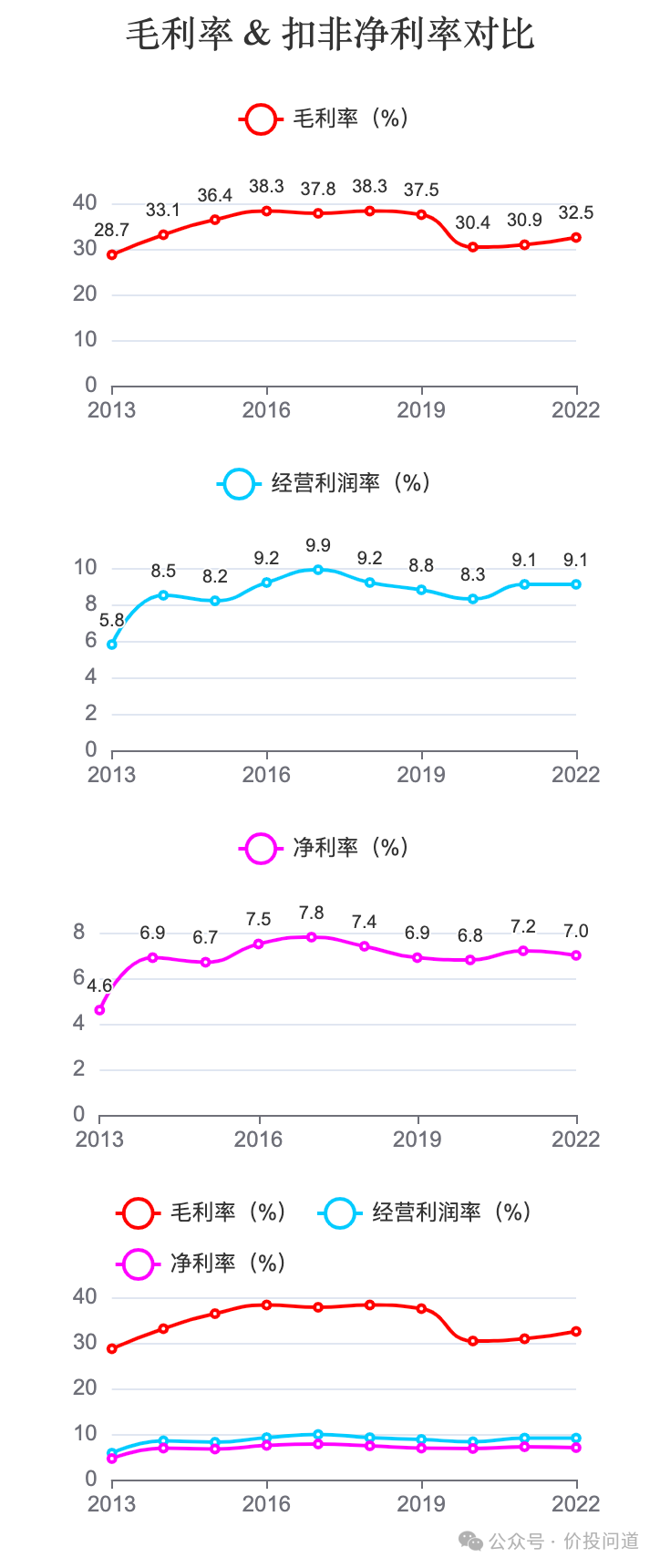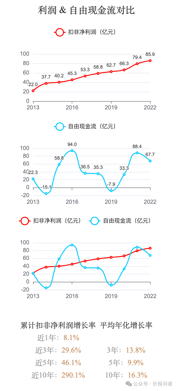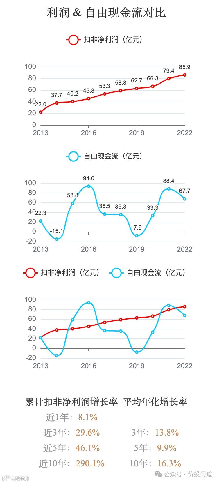 扣非净利润:从2013年22亿增长到了2022年的85.9亿,利润增长和营收增长吻合。