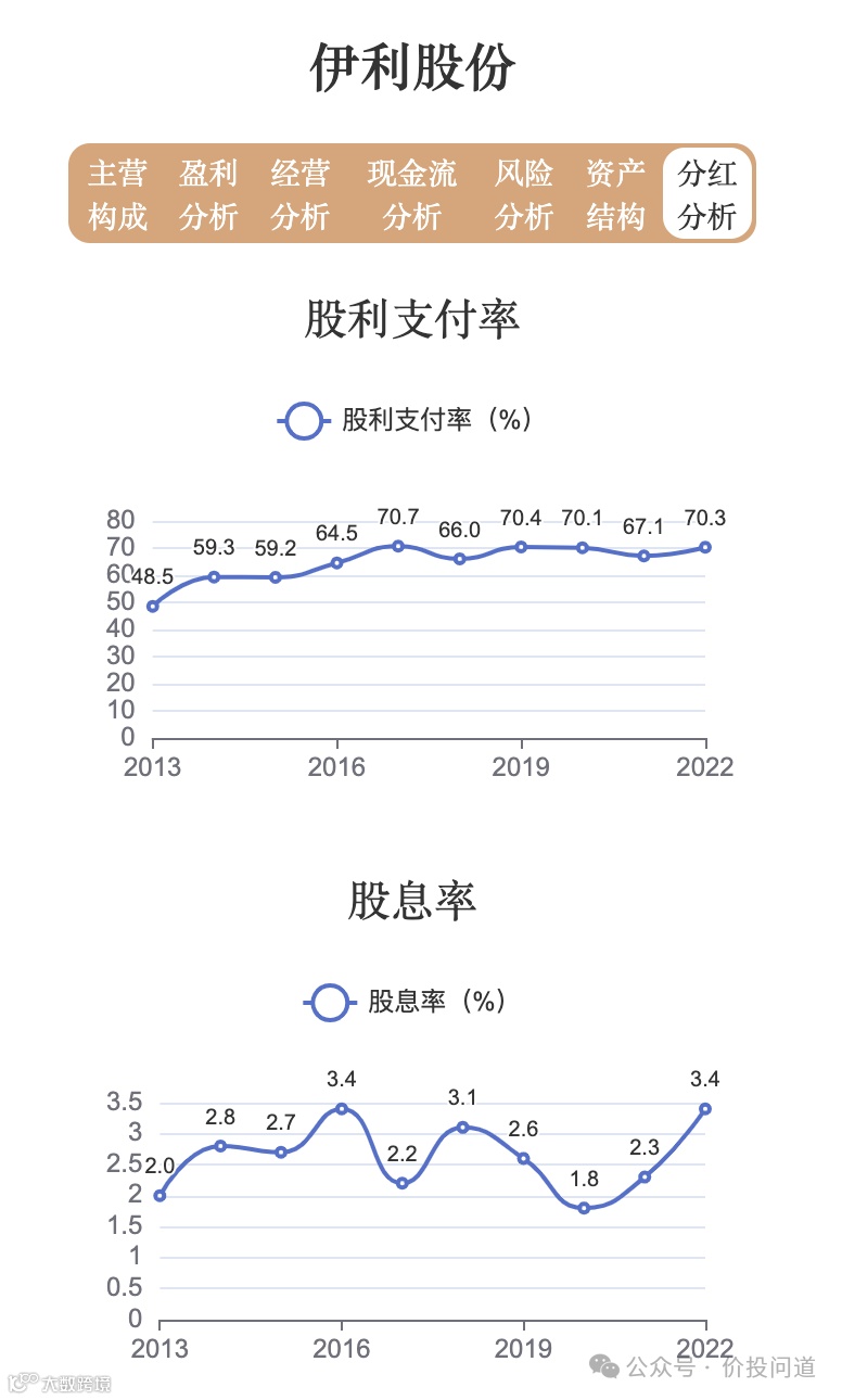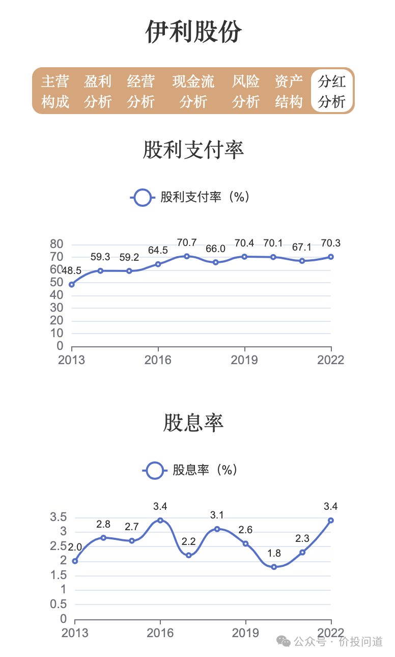2022年现金资产占到30%,经营资产47%,投资资产7%,能看出伊利还是主业驱动的企业,而且现金储备也是充裕的,这么充裕的现金还做大量融资,就要看一下它的分红。