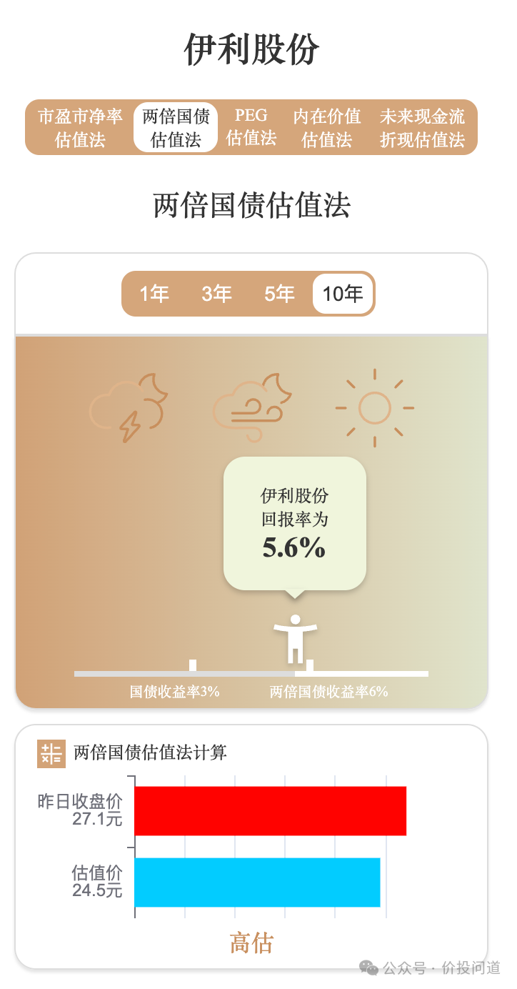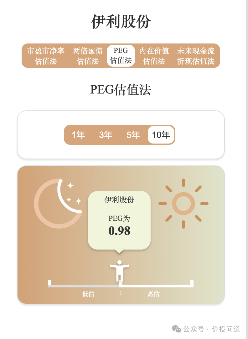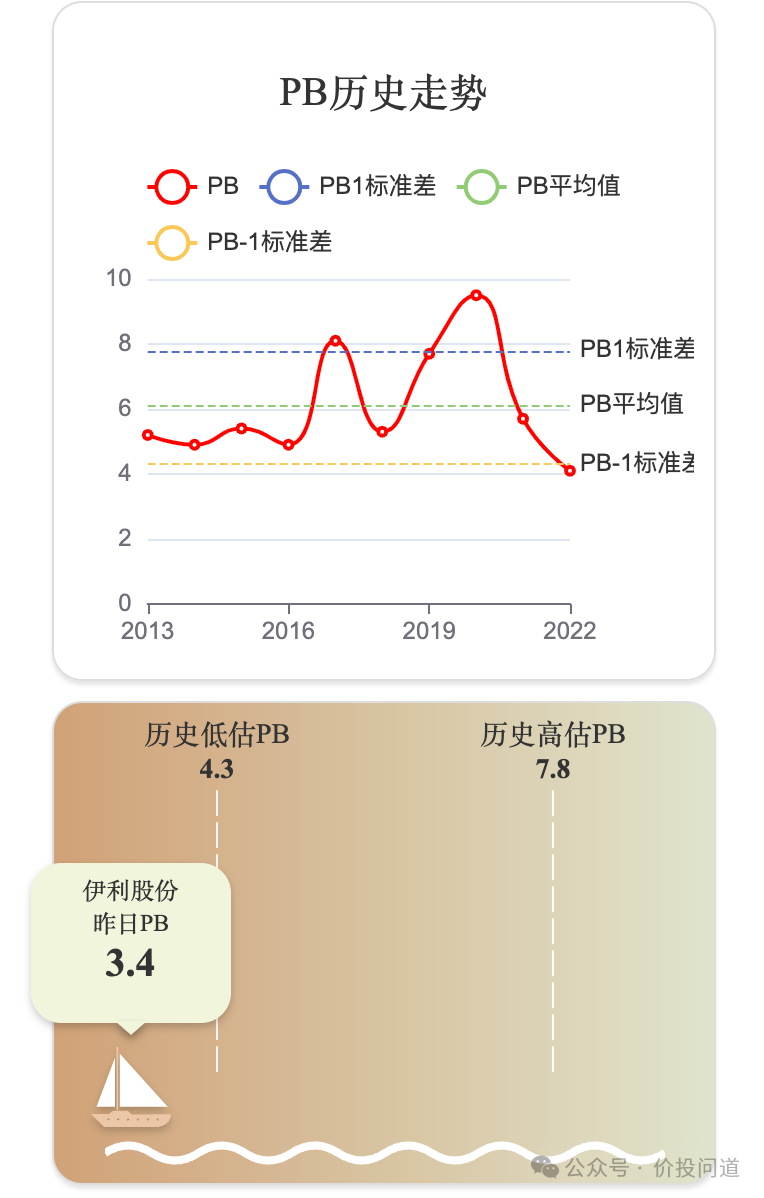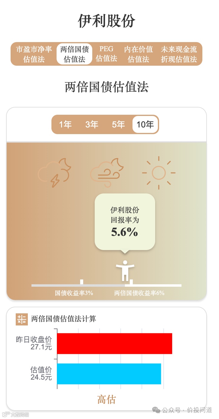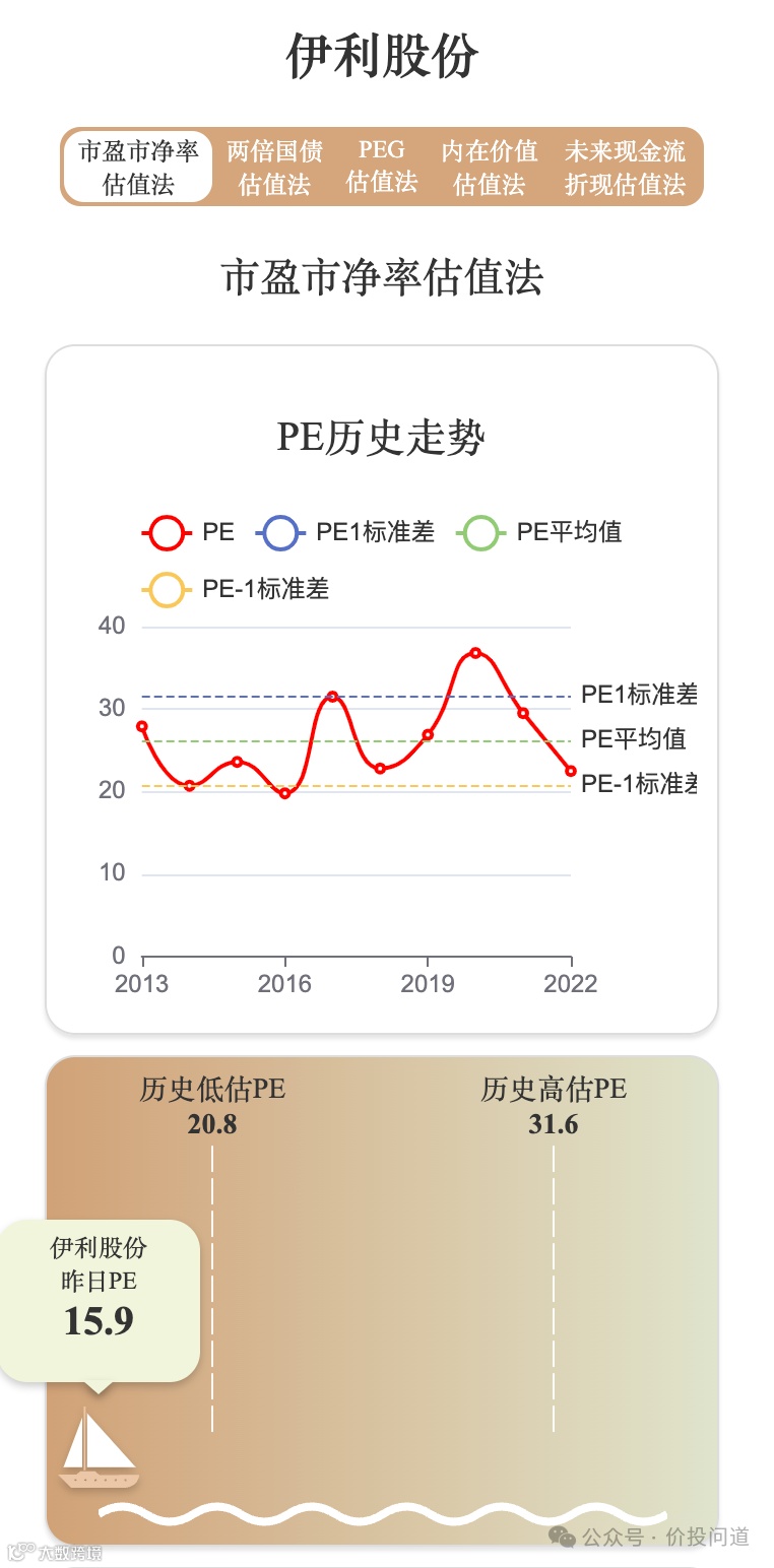 我们再用两倍长期国债收益6%来做锚点估值,伊利的市净率和净资产收益率的比值算出来是5.6%,略低于两倍国债收益,还算是合理估值。