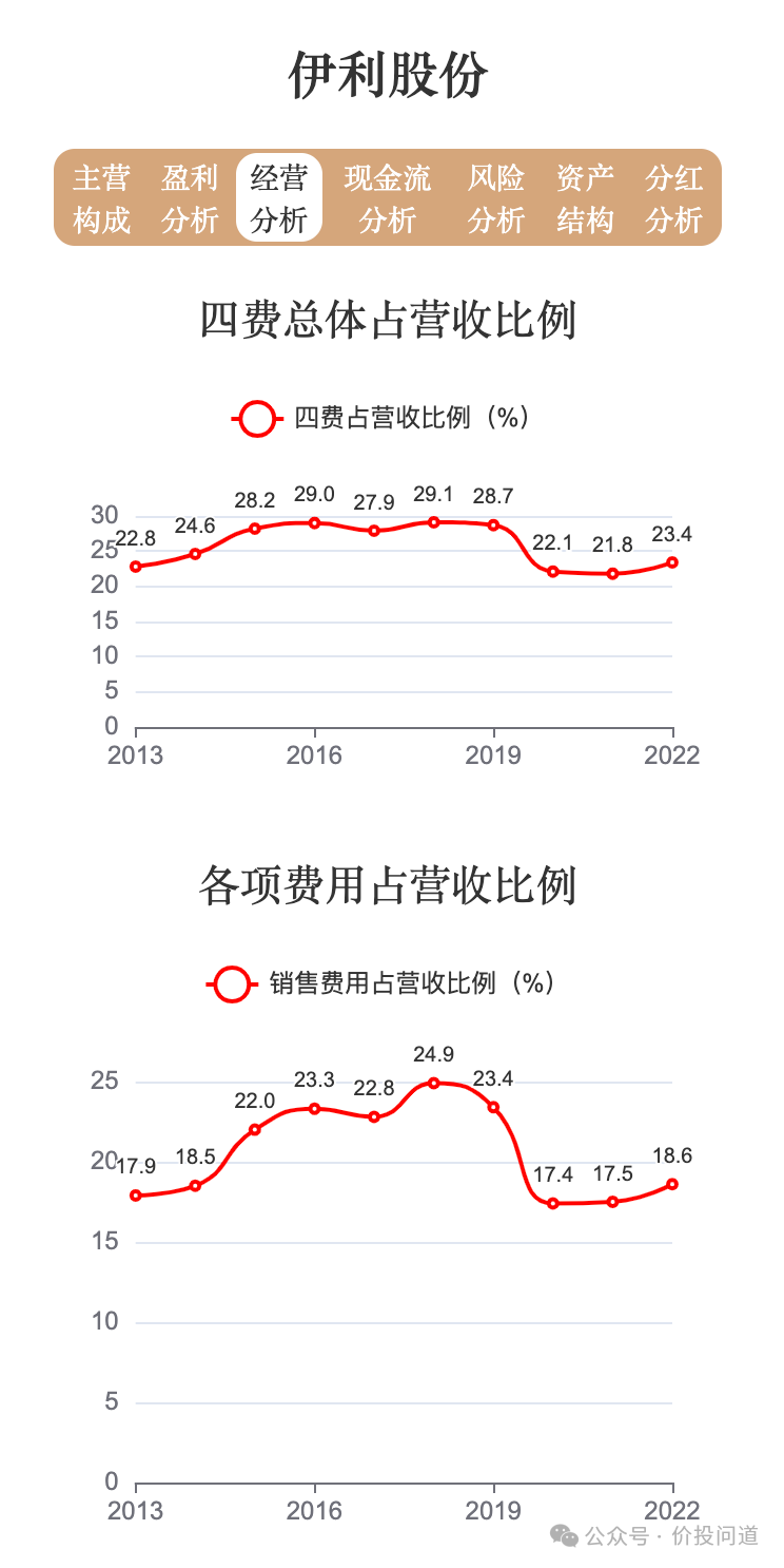 四费占比基本在22%-29%之间波动,很稳定,2022年 23%,略高于光明乳业的16%。
