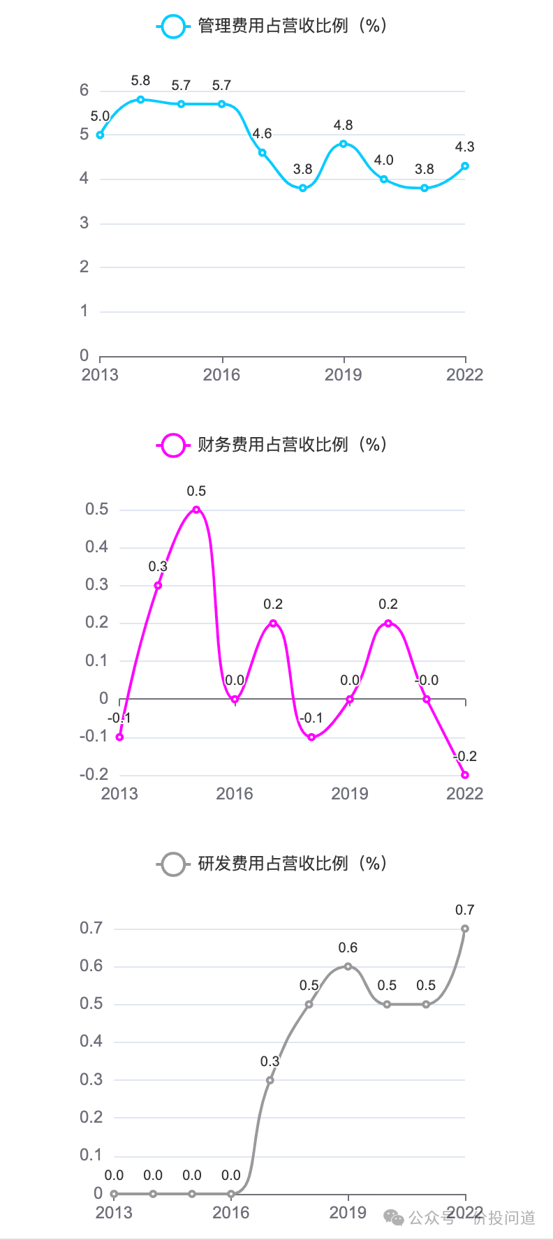 管理费用占比在3.8%-5.8%之间波动,2022年4.3%还算正常。