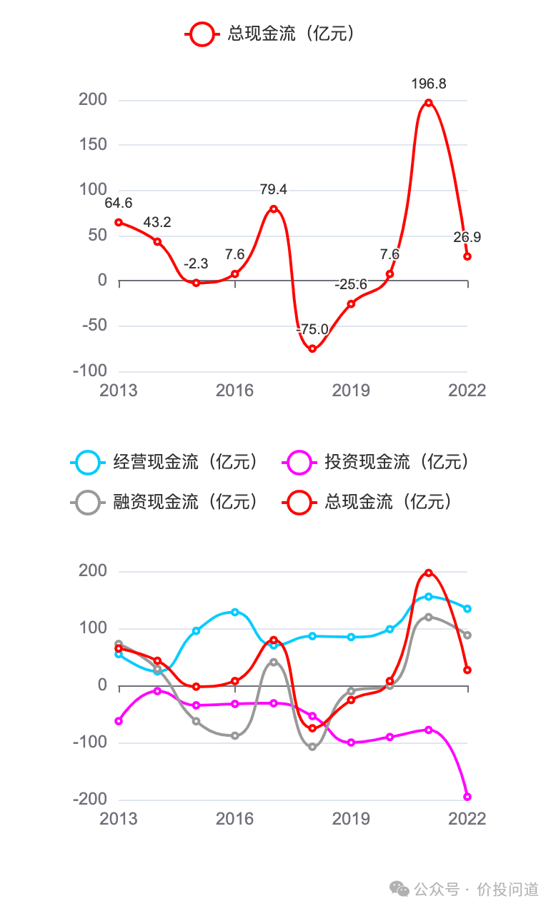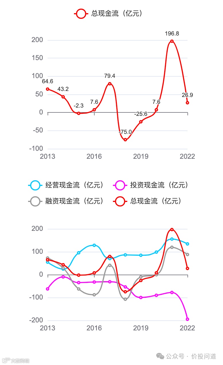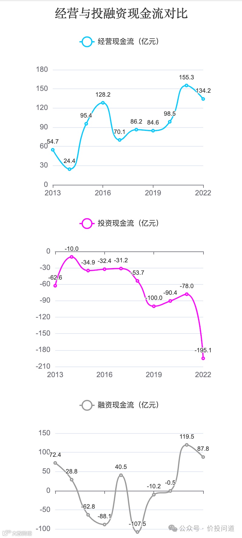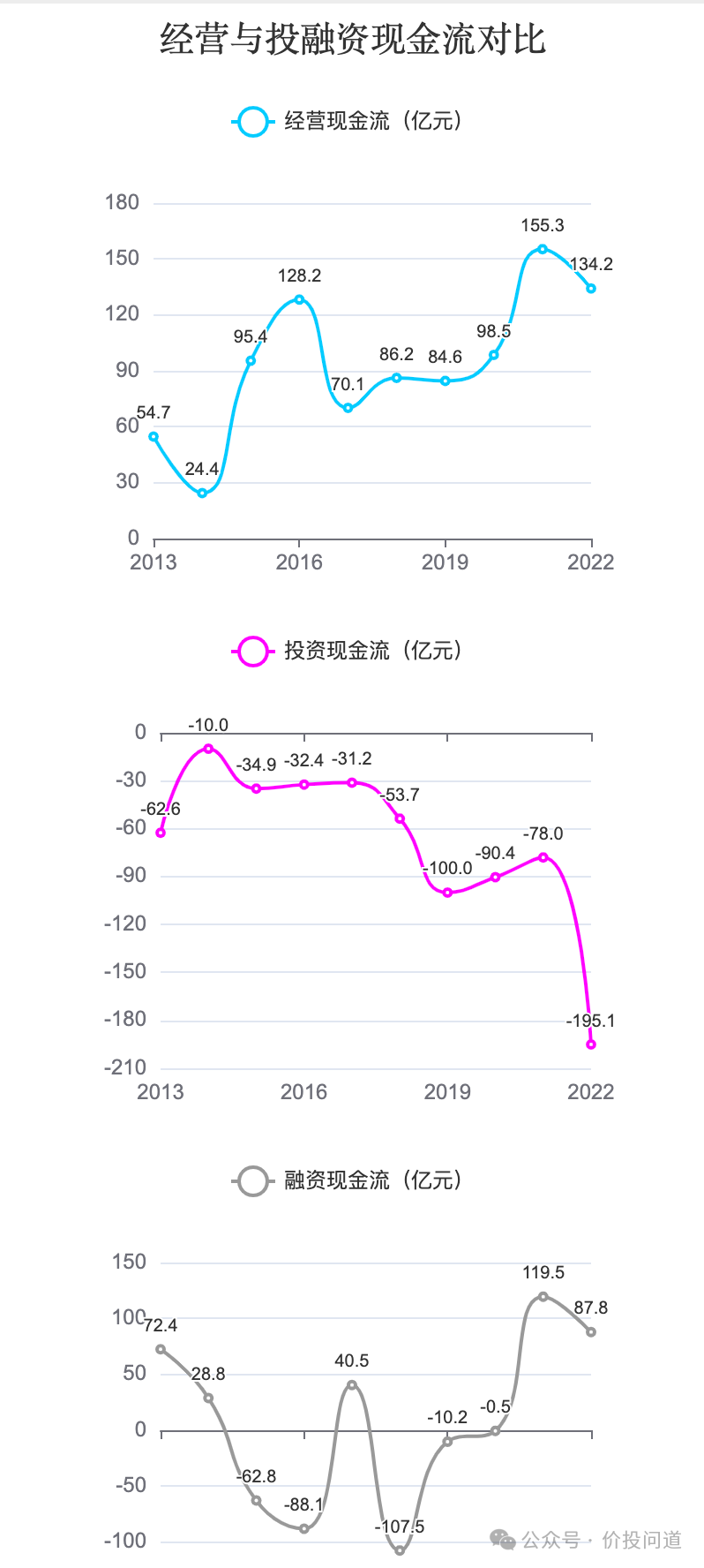 经营现金流还是不错的,波动向上,2022年134亿,高出扣非净利润85亿不少。