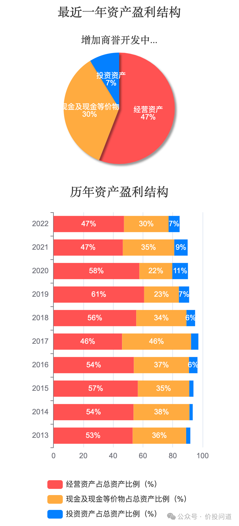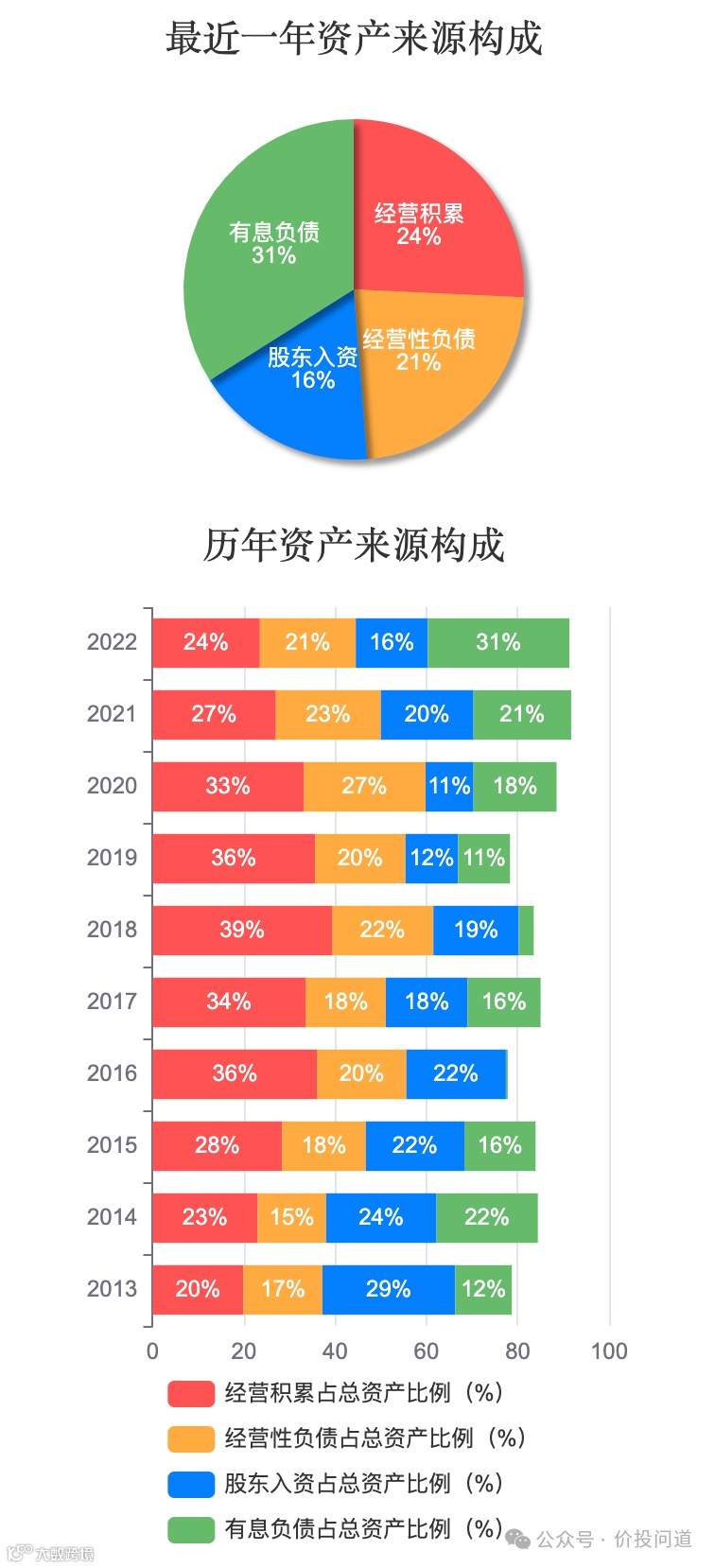 第六部分,盘一下它的资产结构,经营积累占24%,经营性负债21%, 股东入资16%,有息负债31%。