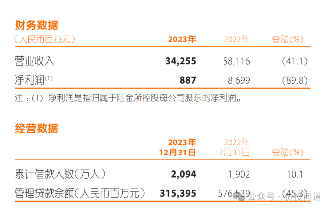 陆金所:营业收入342.55亿,同比下降41.1 %;净利润8.87亿,同比下降89.8 %。截至2023年末,陆金所财富管理平台累计借款人数2094万,较年初增长10.1 %;管理贷款余额3153.95亿,同比下降45.3 %。