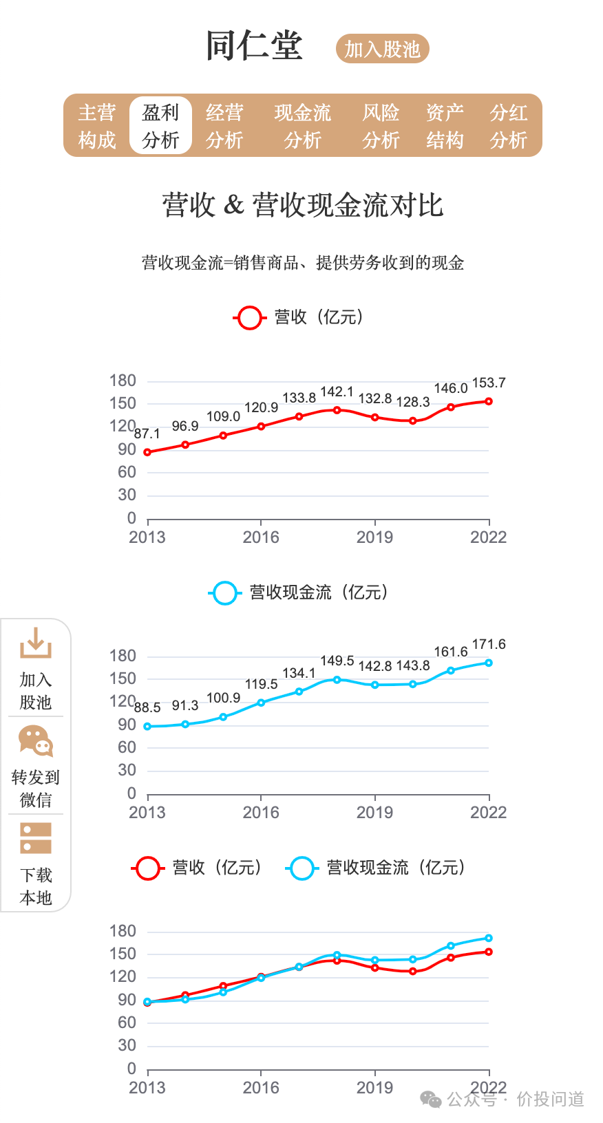自由现金流从2013年2.5亿,到2022年27.6亿,自由现金流远高于扣非净利润,品牌中药企业资本再投入很少,这是很大的优势,赚的是真金白银。