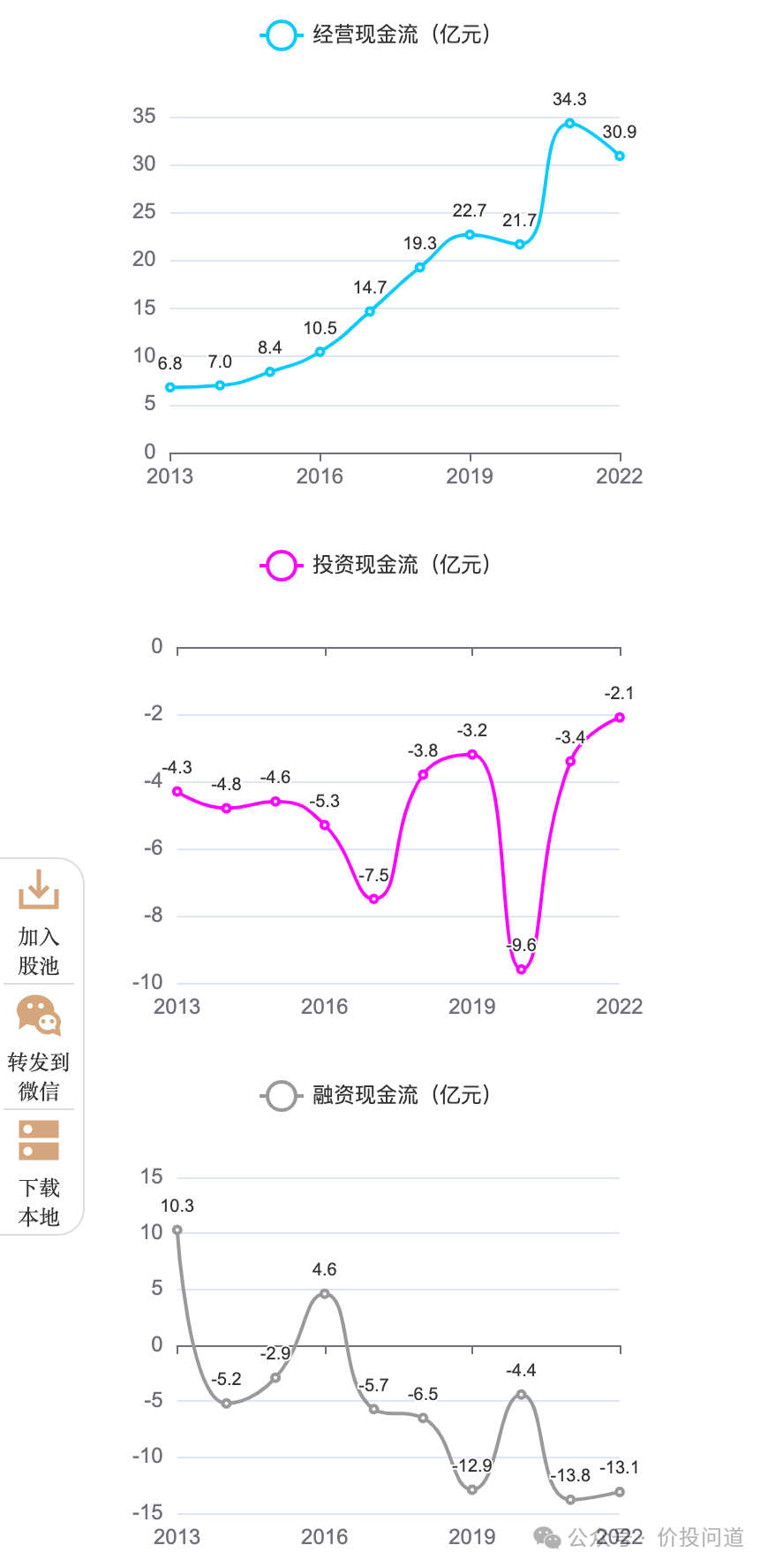 经营现金流持续为正,从2013年6.8亿到2021年高点34亿,2022年30亿,经营现金流还是有不错的增长。