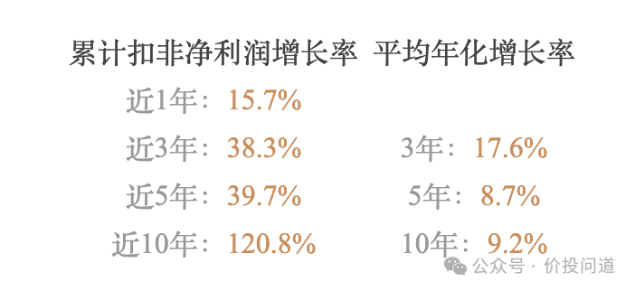 近一年增长15.7%;近三年累积增长:38.3%,平均每年17.6%;近五年累积增长39.7%,平均每年8.7%;近十年累积增长120.8%,平均每年9.2%,增长还是比较稳健的。
