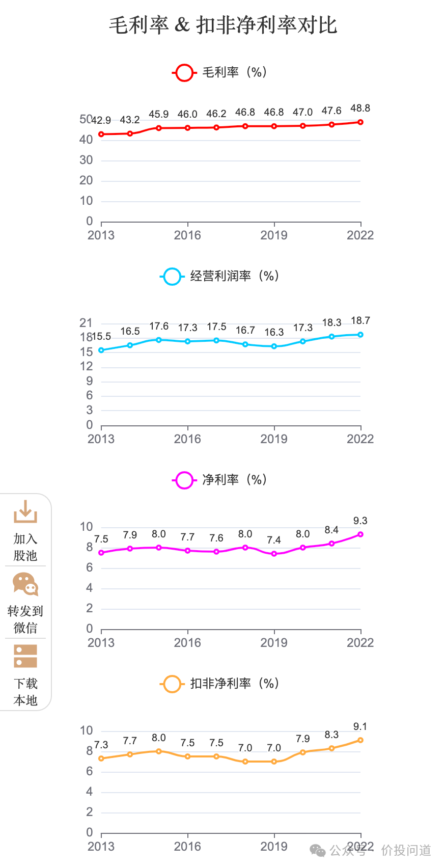 毛利率2013年42%到2022年48%,稳步上升。品牌力还是比较强的。