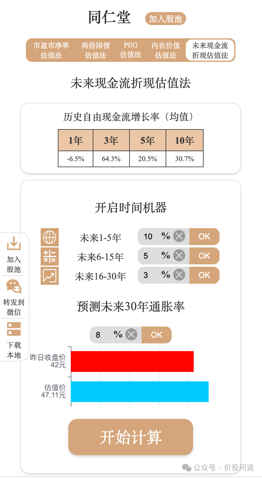 假设未来30年里,前5年自由现金流每年增长10%,中间10年5%,最后15年3%。假设未来三十年每年都通货膨胀率是8%。按照这个折现率估算,目前同仁堂的价格应该是47元比较合理。而目前实际上是42元,还算合理。