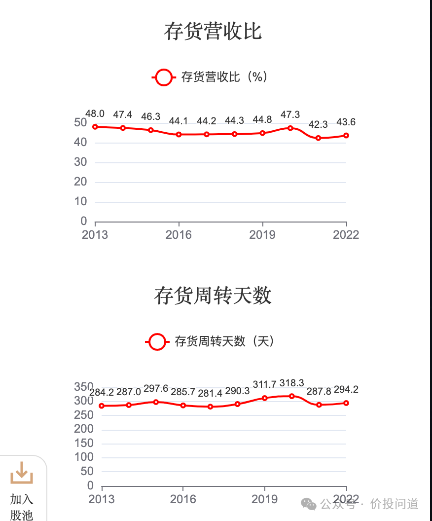 存货周转天数波动较小,2022年294天。片仔癀是从2013年的373天持续下降到了192天。片仔癀要精进一些。