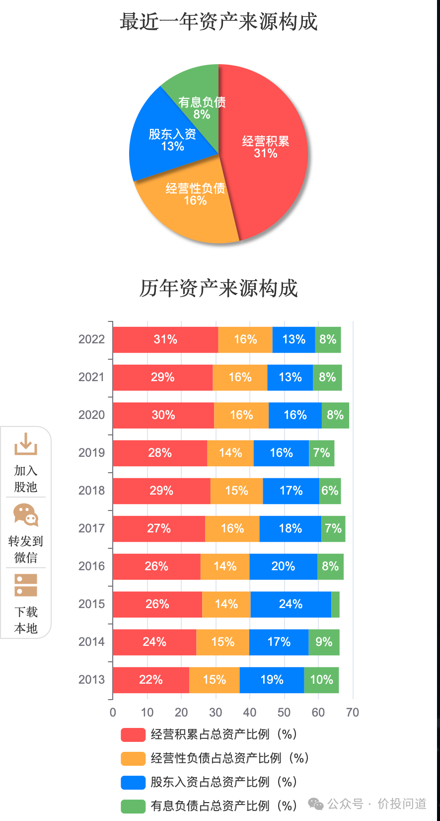 经营积累占比31%,经营负债占16%,股东入资13%,有息负债8%,近十年主业一直稳步增长,经营积累也是稳步提升的。