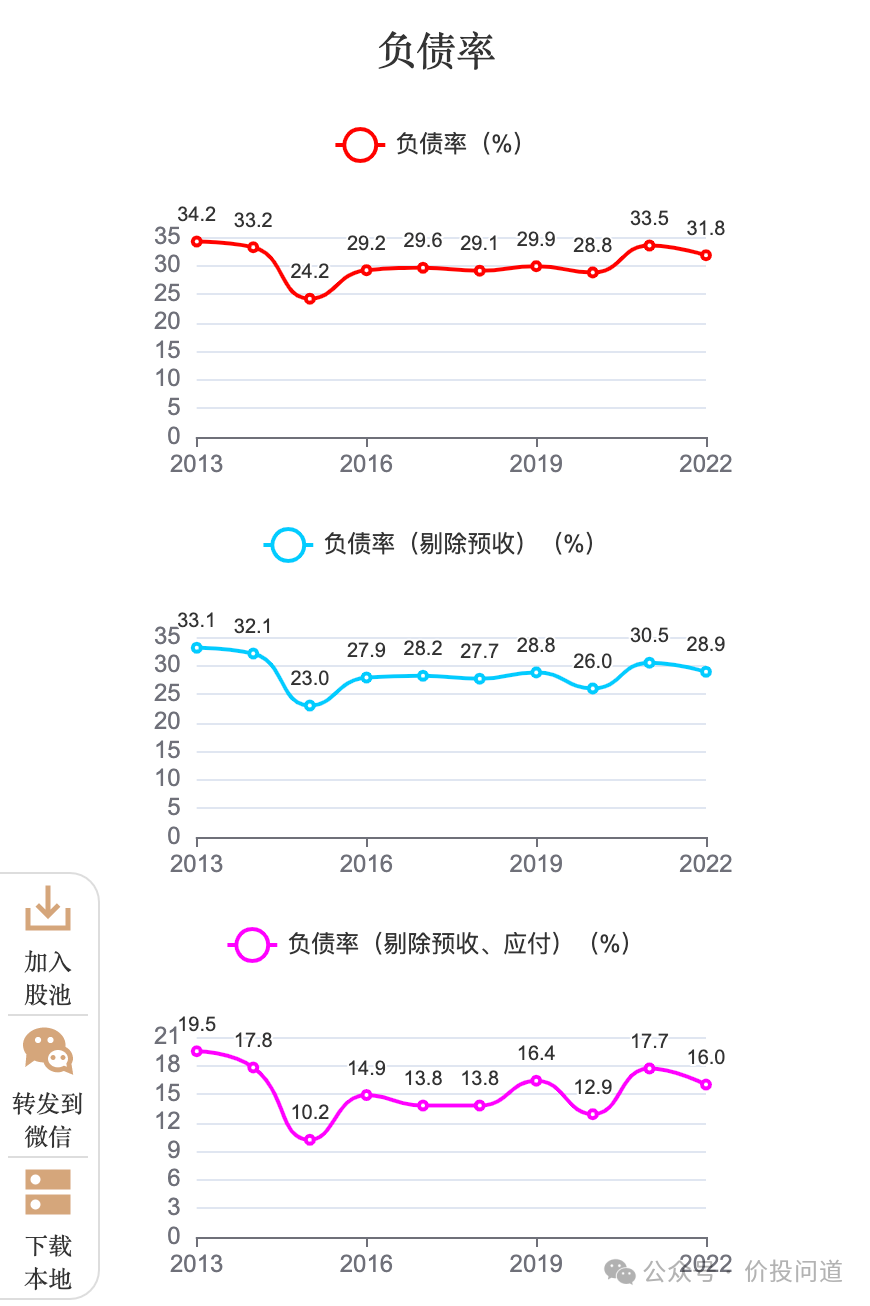 近十年负债率在30%左右波动,2022年31%.剔除预收、应付后16%,负债率很健康。