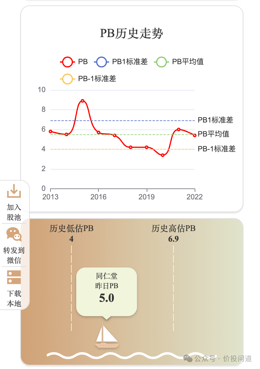 现在估值和自身历史相比还是低了,同仁堂这样的品牌力,投资者给予的估值一直都比较高。不过,对应这样的增长速度,我个人还觉得有点偏高。