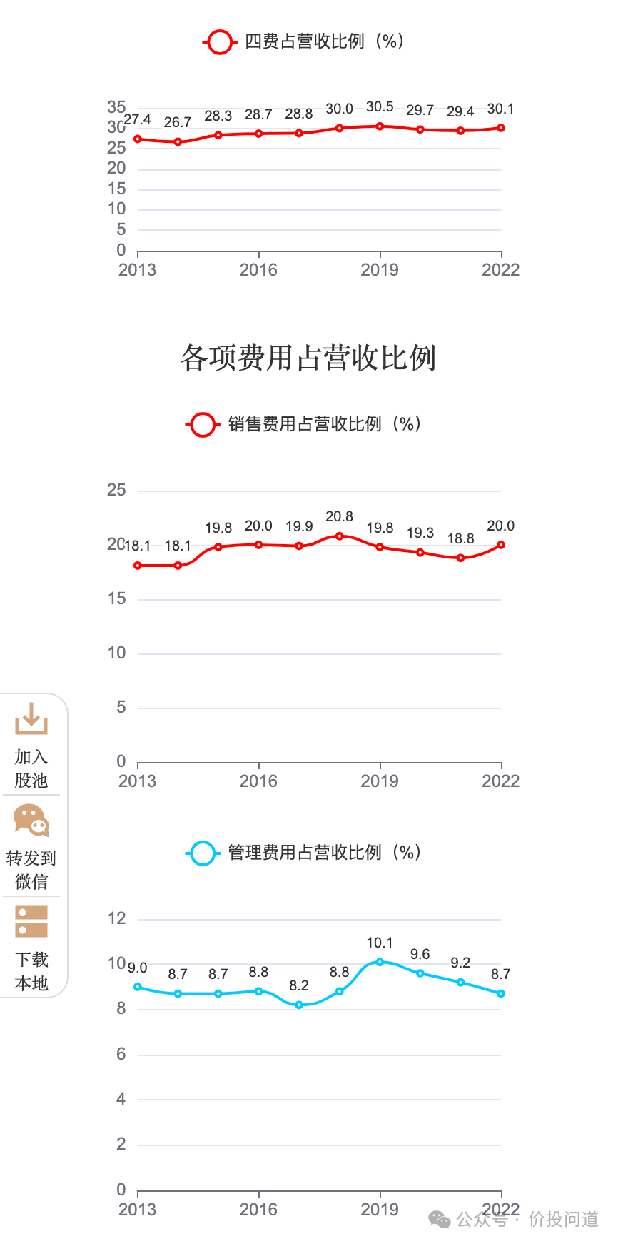 销售费用占比在18%到20%之间波动,片仔癀从高点11%降到了2022年5.6%。