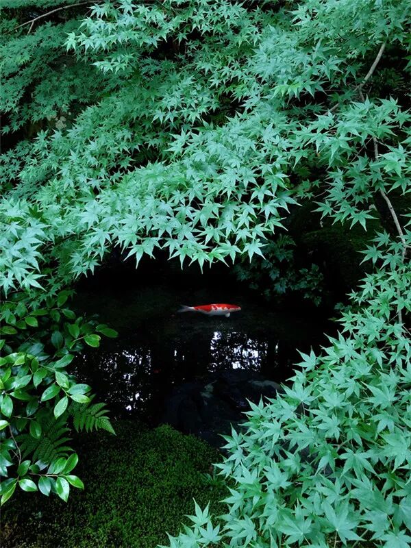 琉璃光院浓绿环绕下的池塘里偶然闪过一只红白锦鲤,好似浮游在空气中一般空灵梦幻。(作者:AmyLi。拍摄地点:京都市琉璃光院)