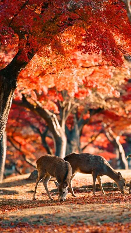 秋日的奈良公园,枫叶被染得通红,晨间的阳光穿透树林,鹿群在树下觅食,一静一动,一幅大自然和谐的画卷。(作者:Jamie酱。拍摄地点:奈良)